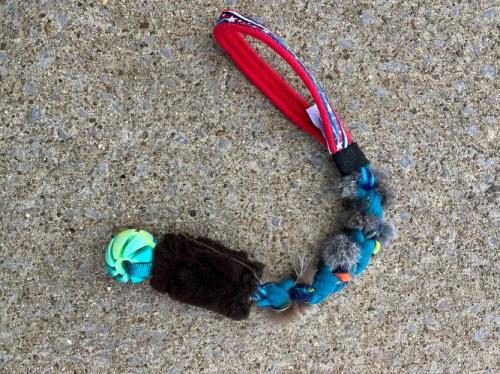 毛皮(ウサギ、アライグマまたはコヨーテ)が編み込まれたフリースタグに暗闇で光る「ムーンボール」を取り付けたチェイサータグが新登場!バンジータイプのハンドル部分にはヒツジの毛皮が取り付けられており、子犬や噛みの強いワンちゃんとのチェイサーゲームやタグプレイが楽しめます。