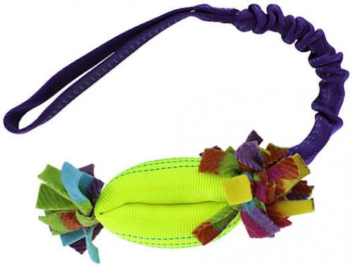 毛皮(ウサギ、アライグマまたはコヨーテ)が編み込まれたフリースタグに暗闇で光る「ムーンボール」を取り付けたチェイサータグが新登場!バンジータイプのハンドル部分にはヒツジの毛皮が取り付けられており、子犬や噛みの強いワンちゃんとのチェイサーゲームやタグプレイが楽しめます。